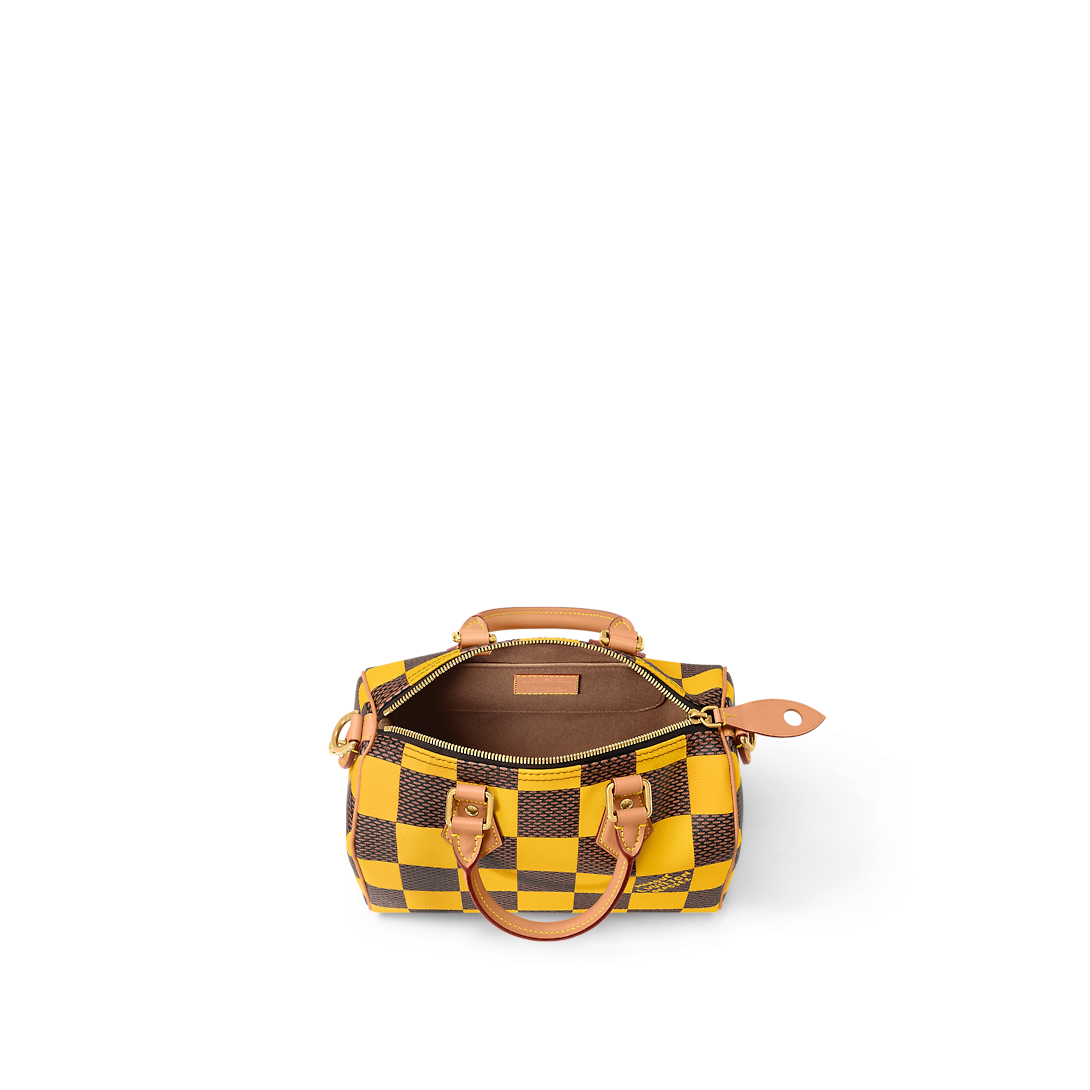 This Speedy 25 Bandoulière Damier Pop displays the same trapezoid lines as the classic Speedy but made from supple Damier Pop coated canvas, the bottom of the bag drapes casually. The new colorway brings a touch of playfulness while the natural cowhide-leather trim and polished gold-color hardware pay homage to the House’s classic bags.