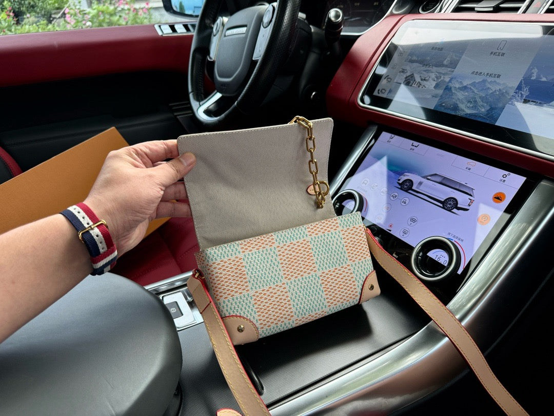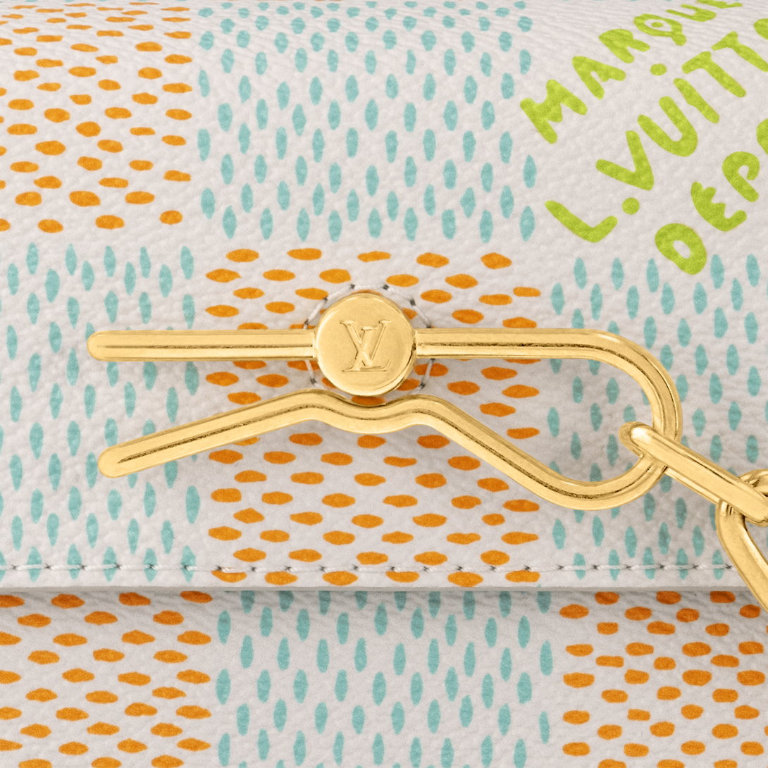 The on-trend Steamer Wearable Wallet is a nano city bag made from Damier Heritage coated canvas, in a bold white colorway. Creative Director Pharrell Williams brings back the original pattern of the Damier canvas from the 1880s, including the “Marque L.Vuitton Déposée” signature, to emphasize the vintage feel.