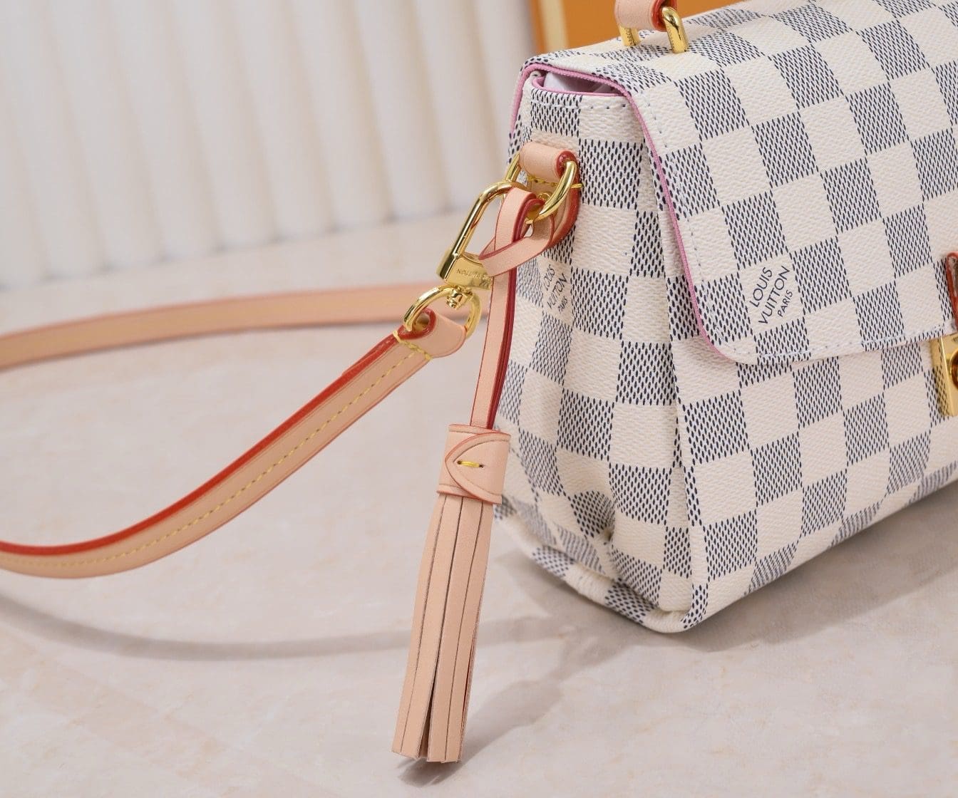 A compact bag with modern lines, the Croisette in summery Damier Azur canvas boasts sophisticated details (note the signature S-lock) and a casual-chic allure. The removable leather tassel adds a touch of fun. Sized to fit the essentials plus a long wallet, this versatile piece can be hand-carried, slung over the shoulder or worn cross-body.