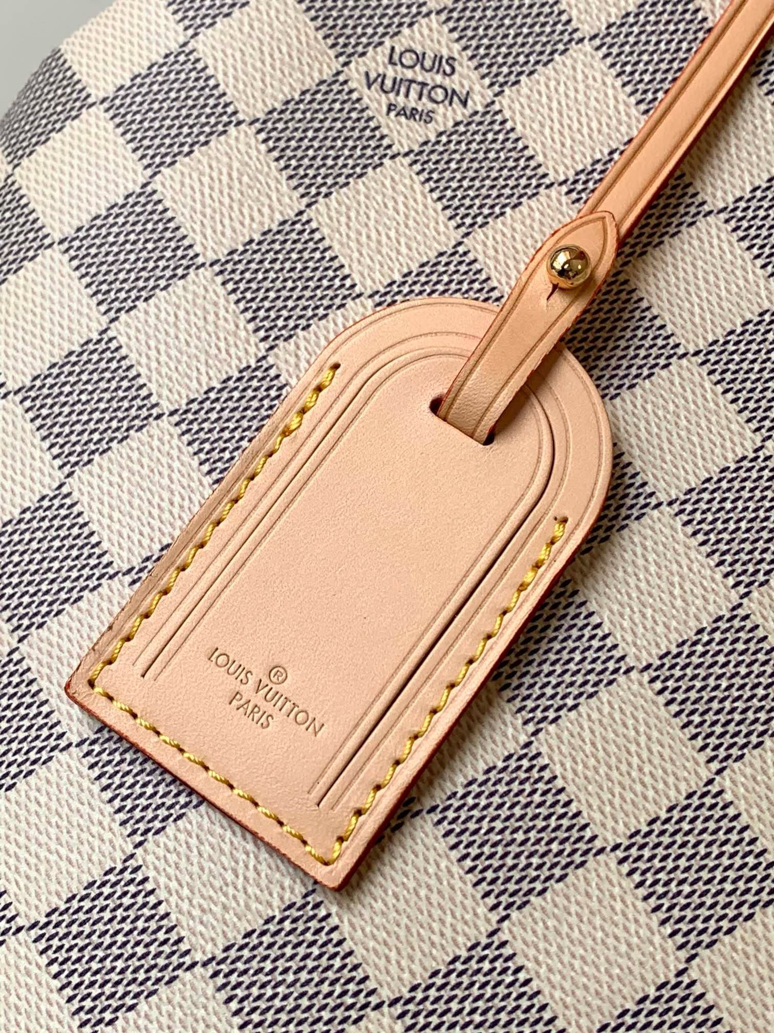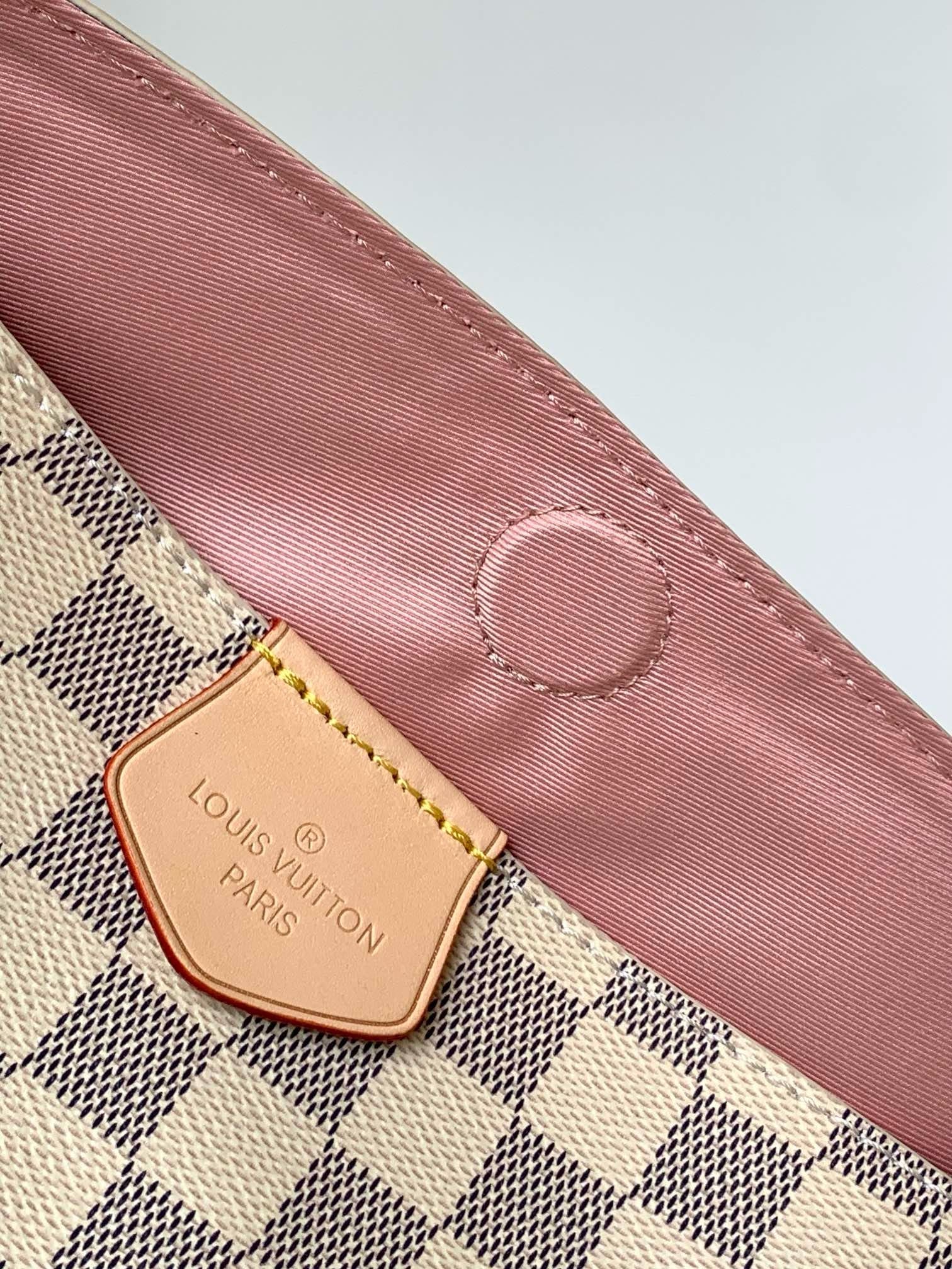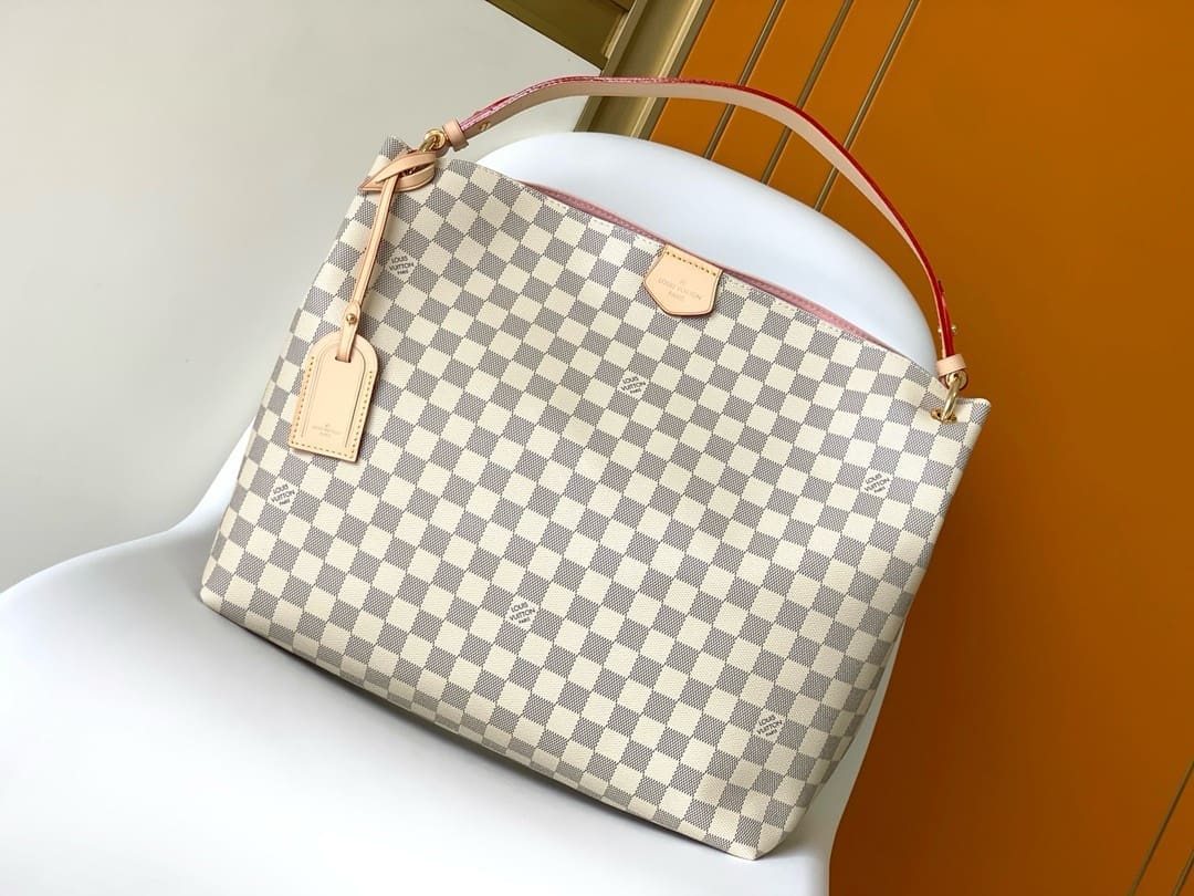 The Graceful MM hobo in fresh Damier Azur canvas is an extra-roomy yet lightweight bag to carry every day. Natural leather detailing and shiny gold-tone hardware add a refined, signature touch. The body-friendly design combines with a supple, flat handle for stylish and comfortable over-the-shoulder wear. The magnetic closure and zipped inside pocket keep belongings secure.