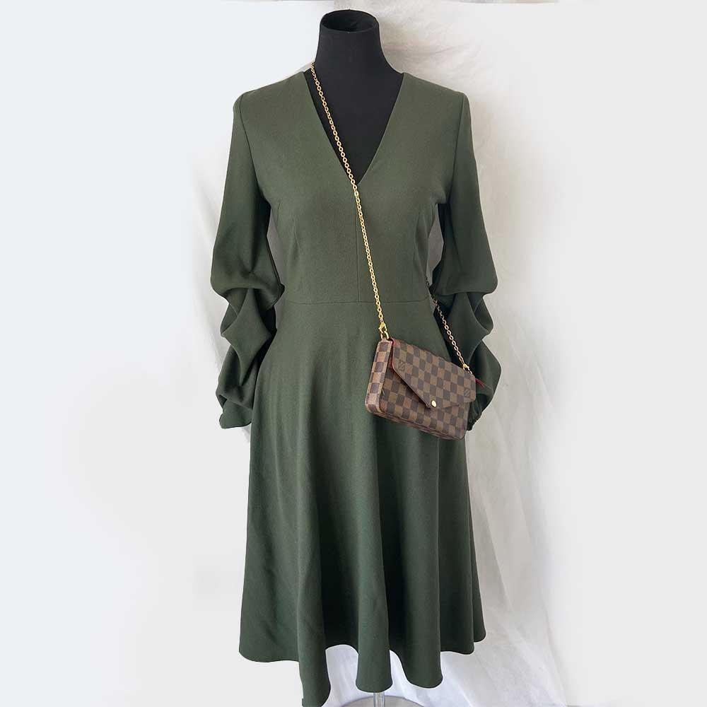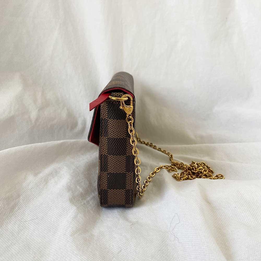Description : Louis Vuitton Pochette Félicie Damier bag with two removable pockets, featuring Damier Ebene coated canvas and cowhide leather, red textile lining, gold-colour hardware, press stud closure, removable zipped pocketRemovable flat pocket with 8 card slots