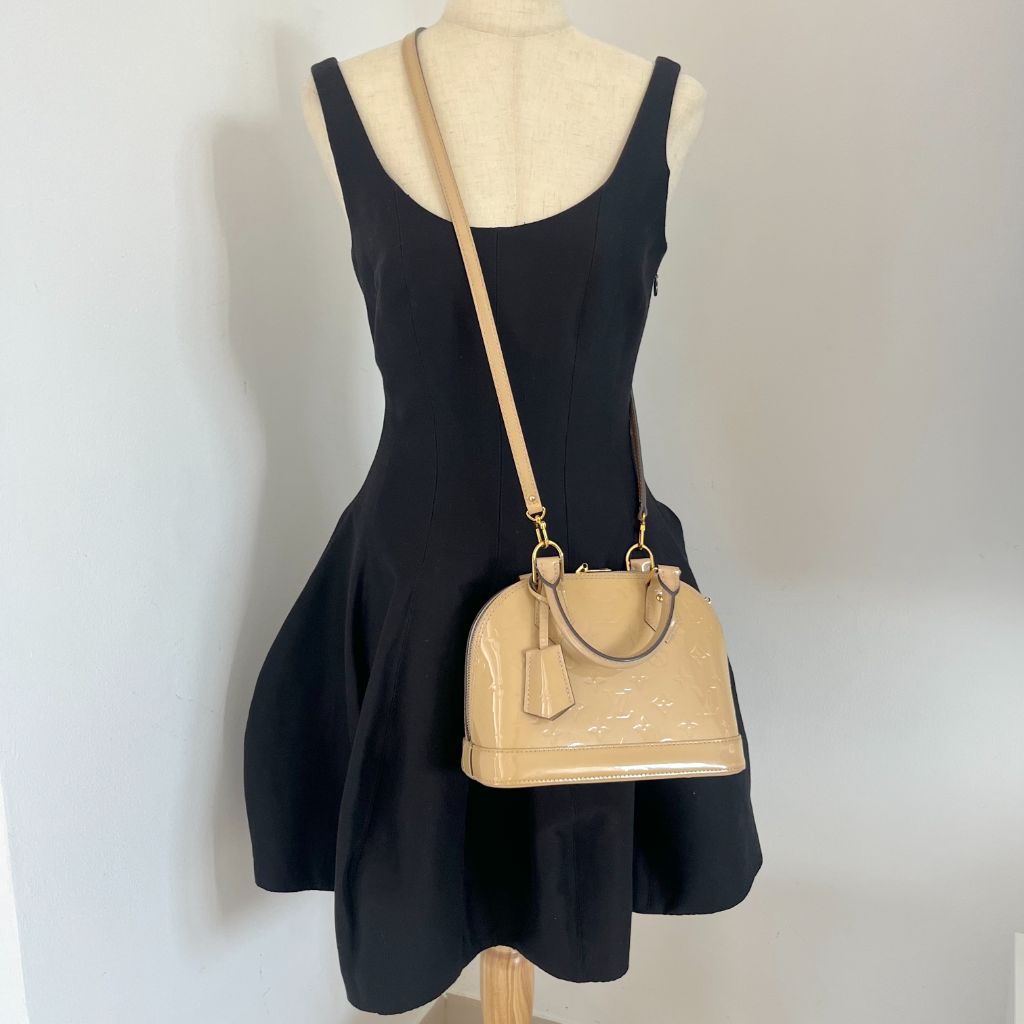 Louis Vuitton vernis monogram alma bb top handle bag with gold-tone hardware, comes with crossbody bag and key and lock