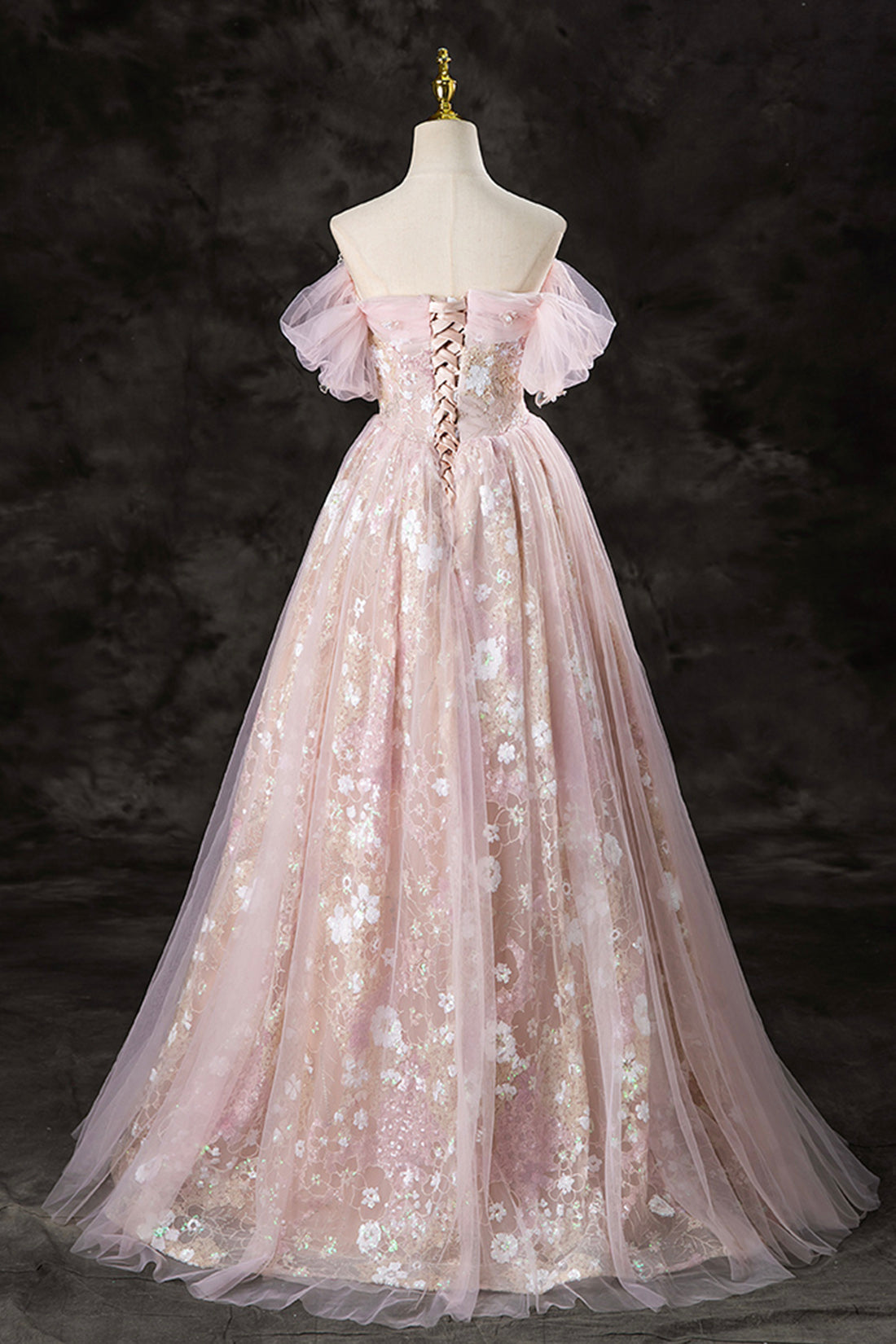 Lovely A-Line Off the Shoulder Sequins Prom Dress, Pink Tulle Corset Floor Length Evening Dress