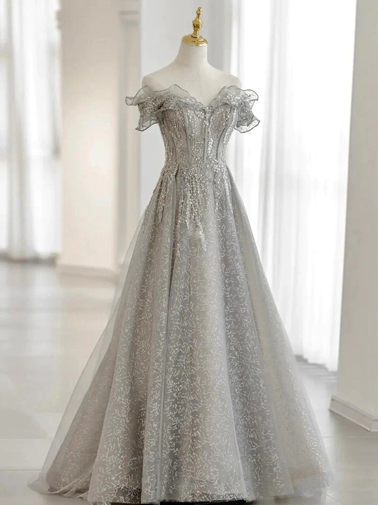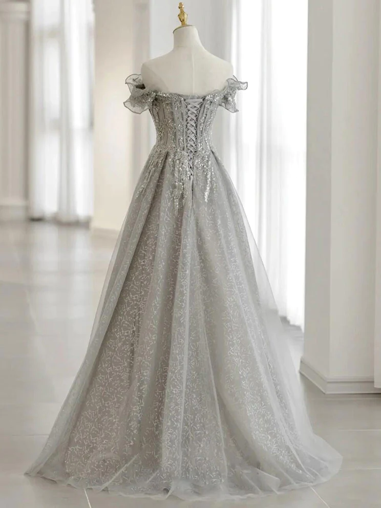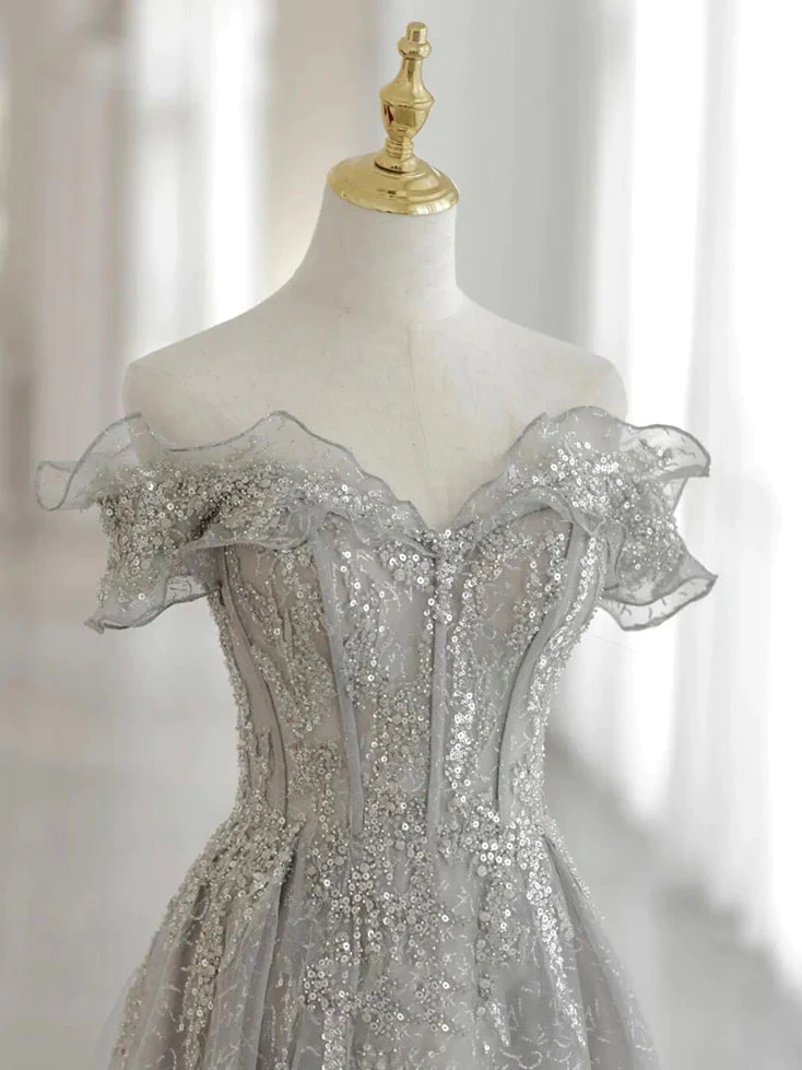 Gray Tulle Sequin Lace Off Shoulder Long Prom Dress, Gray Evening Dress gh2576