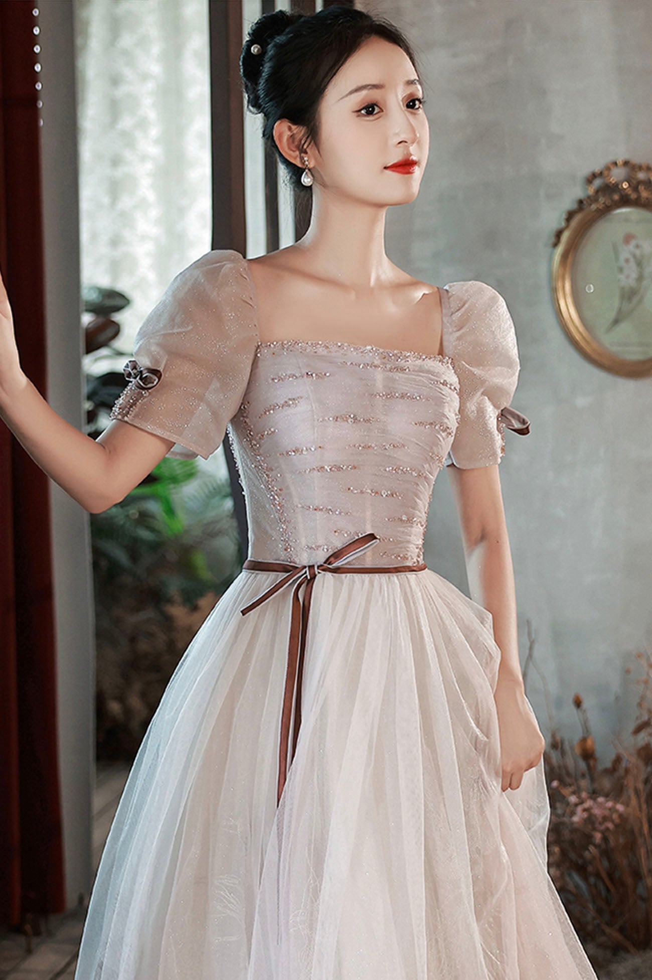 Lovely Tulle Sequins Long Prom Dress, A-Line Short Sleeve Evening Dress