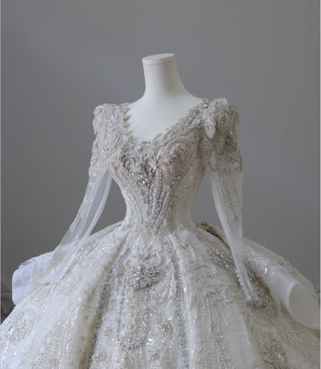 Luxurious beaded long-sleeved sparkling palace retro floor-length wedding dress P2581