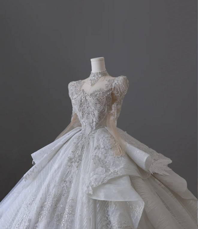 Luxurious French Retro Long Sleeve Beaded Floor-Length Princess Wedding Dress P2554