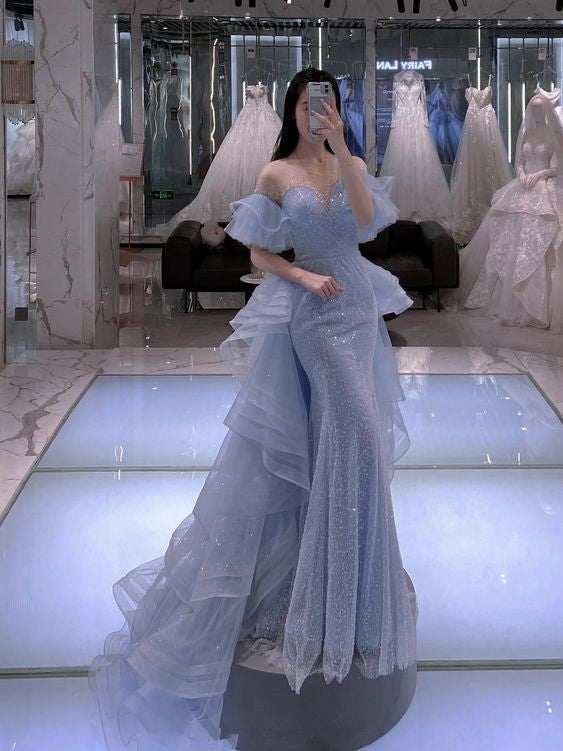 Mermaid Off The Shoulder Light Sky Blue Sequin Prom Dress P609