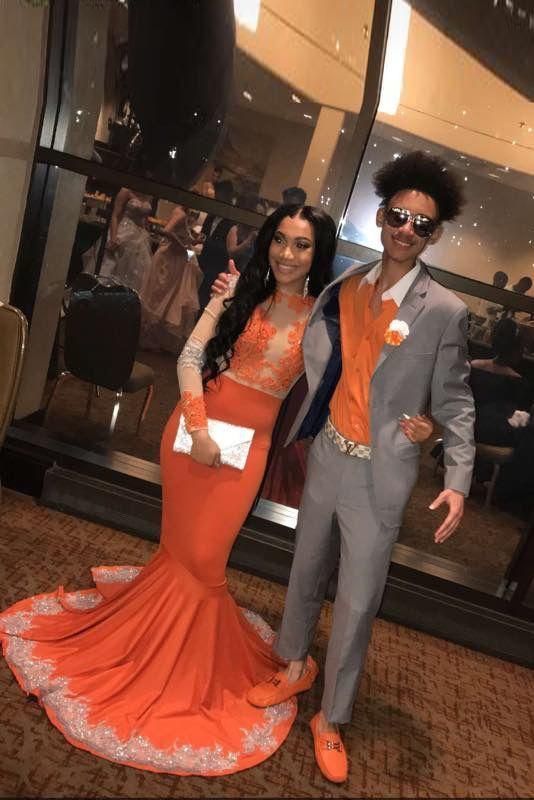 Mermaid Satin Long Sleeves Appliques Lace Prom Dresses cg20261