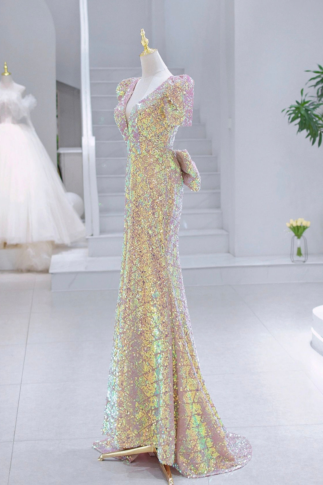 Mermaid Sequins Long Prom Dress, V-Neck Short Sleeve Evening Dress