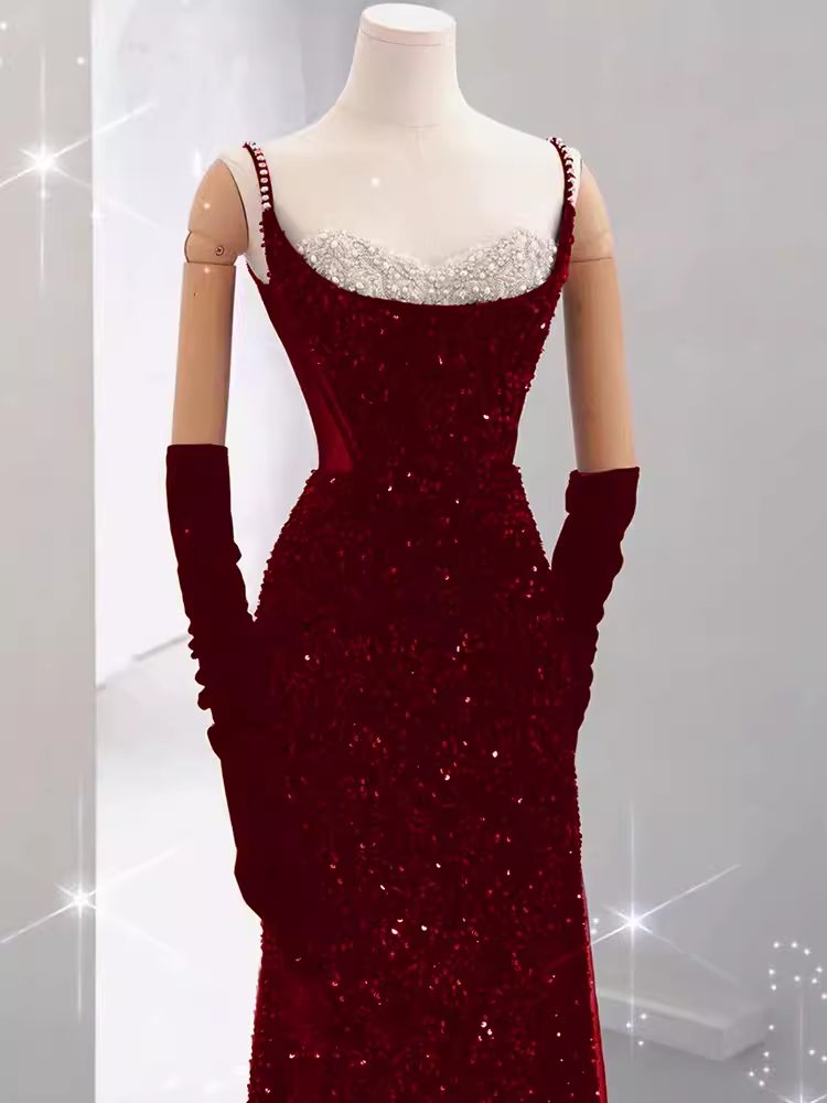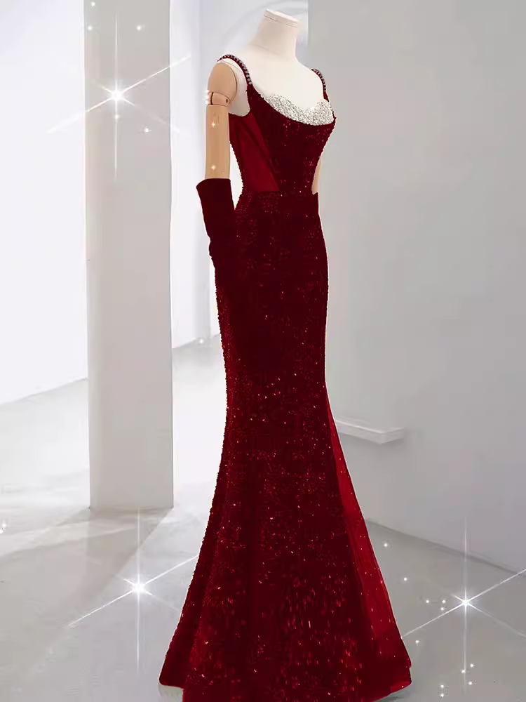 Mermaid Straps Sequin Red Backless Long Prom Dresses P1060