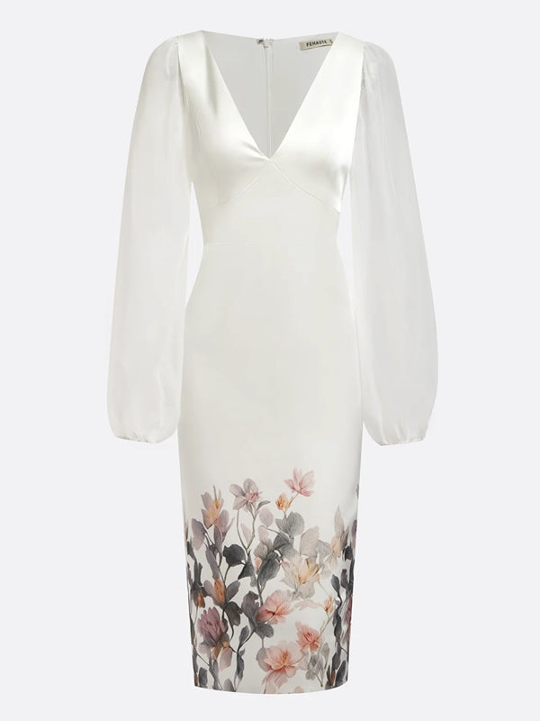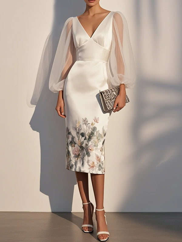 Mesh Floral V Neck Balloon Sleeve Sheath Midi Satin Dress