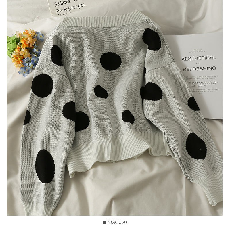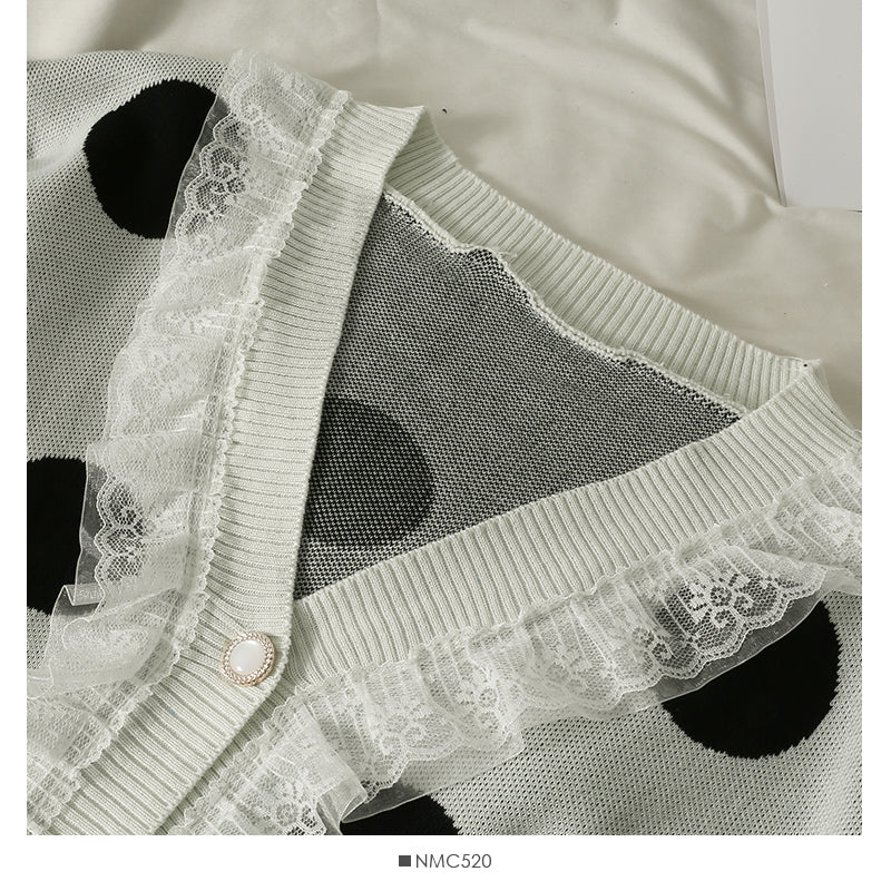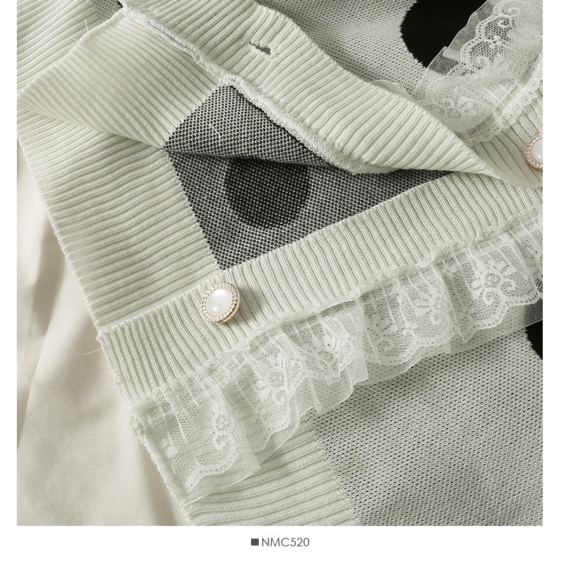 Mesh stitched large wave point low neck two button sweater female 1905
