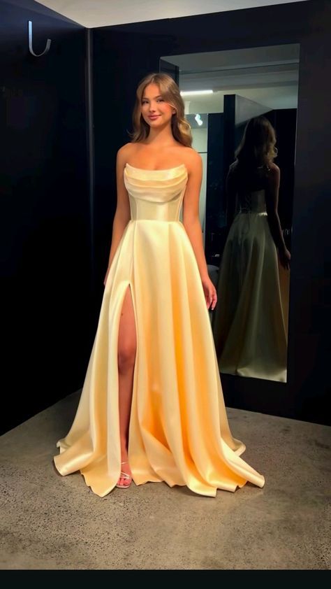 Modest A line Strapless Yellow Slit Satin 20th Birthday Dress Prom Dress 18th Birthday Outfits For Women W0170