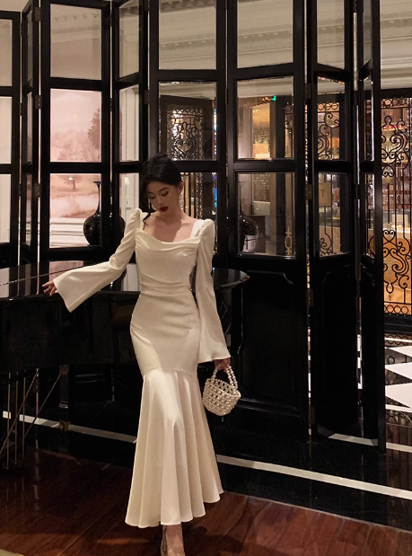 Modest Mermaid Long Sleeves White Satin 21st Birthday Dress Party Gown Birthday Outfits Birthday Dress Ideas For Women DP1472