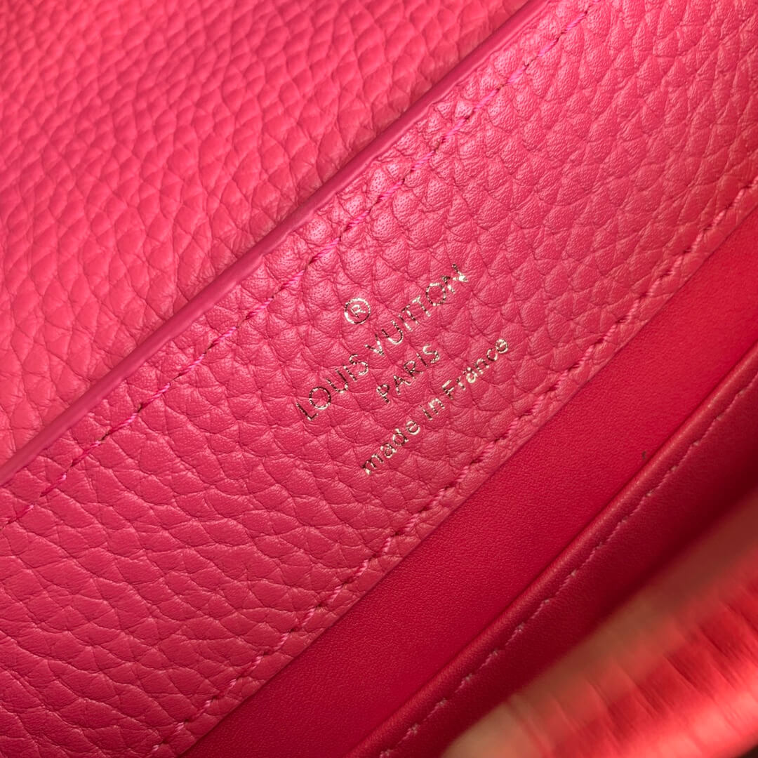 Capucines BB handbag is made of soft Taurillon leather. The flip cover and top handle are shaped with gorgeous python leather, and part of LV logo is cleverly wrapped. The flap can be folded in or out, and the detachable wide leather shoulder strap can be used for shoulder and back selection.