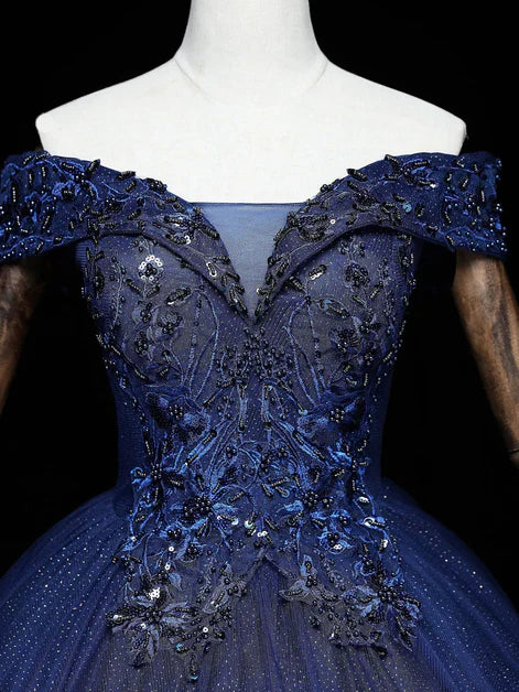 Navy Blue A-Line Tulle Beading Off Shoulder Party Dress, Navy Blue Lace Applique Sequin Prom Dress ED01418