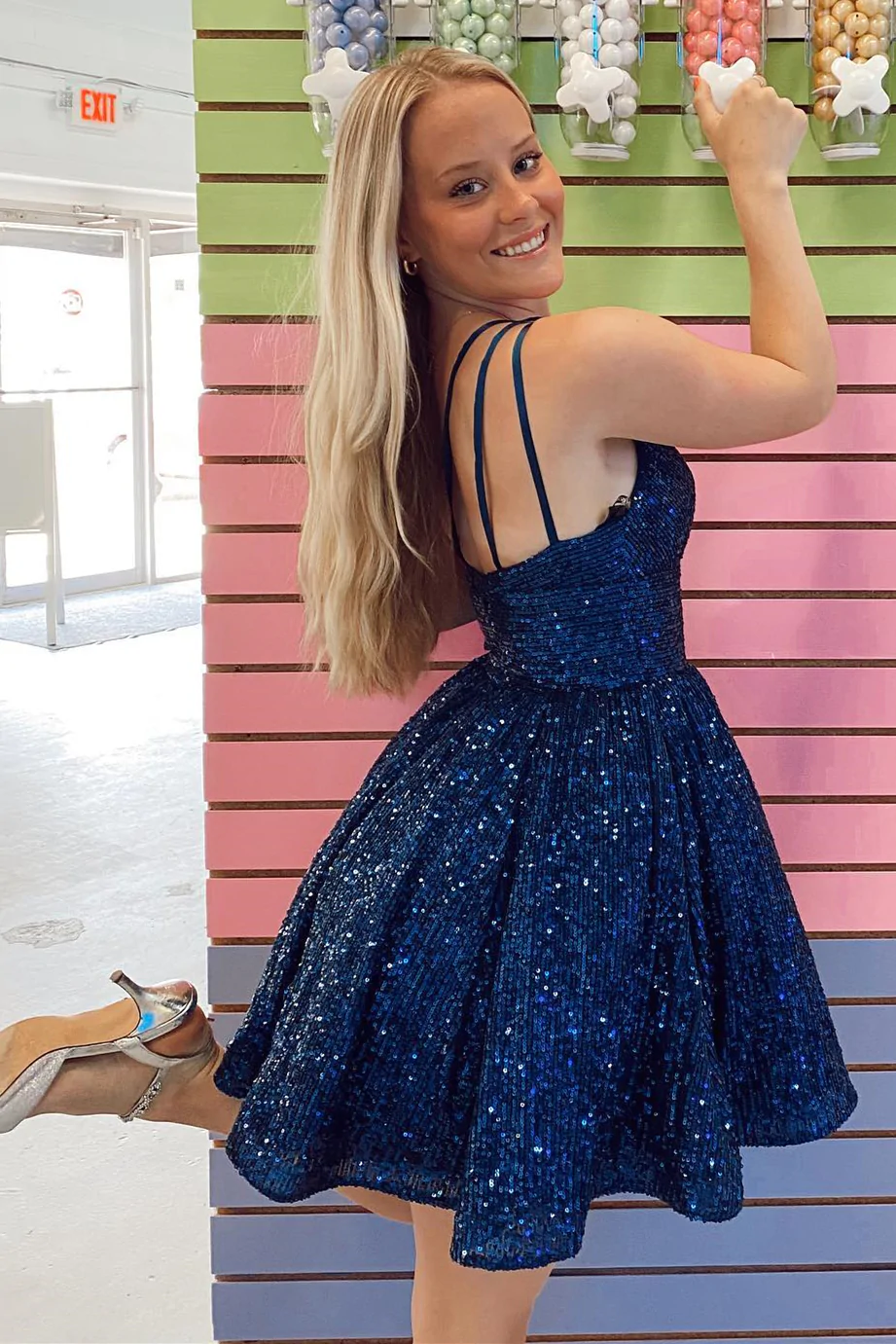 Navy Blue Sequins One-Shoulder A-Line Short Homecoming Dress gh1406