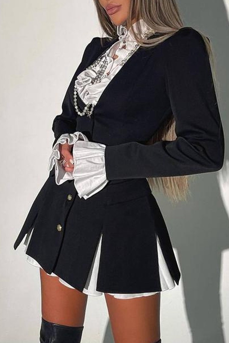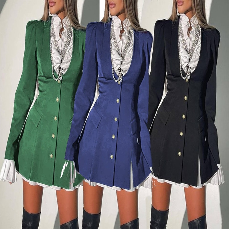 loveedsTM-New Patchwork Single Breasted Office Shirt Dress Elegant V-neck Pleated Party Mini Dresses Autumn Long Sleeve Slim Women Dress
