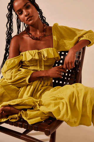 Simple cotton mid length dress from our most comfortable collection. It has a loose, flowing shape with a stretchy top and puffy sleeves.