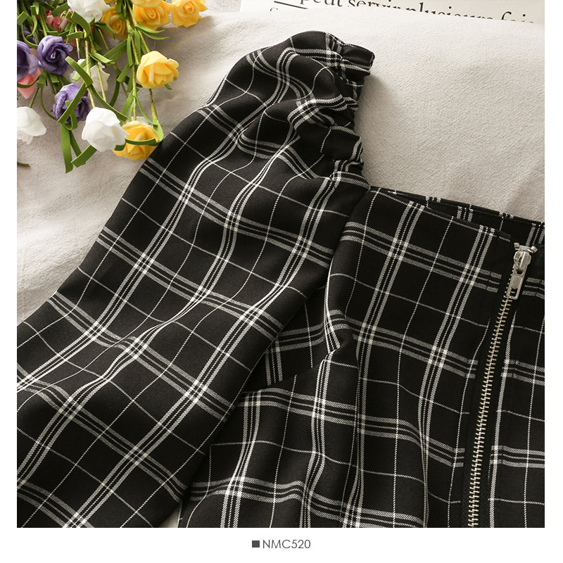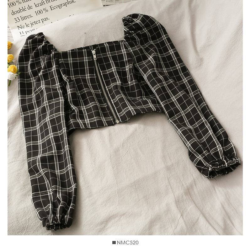 Off shoulder exposed clavicle zipper bubble sleeve top high waist skirt 2490