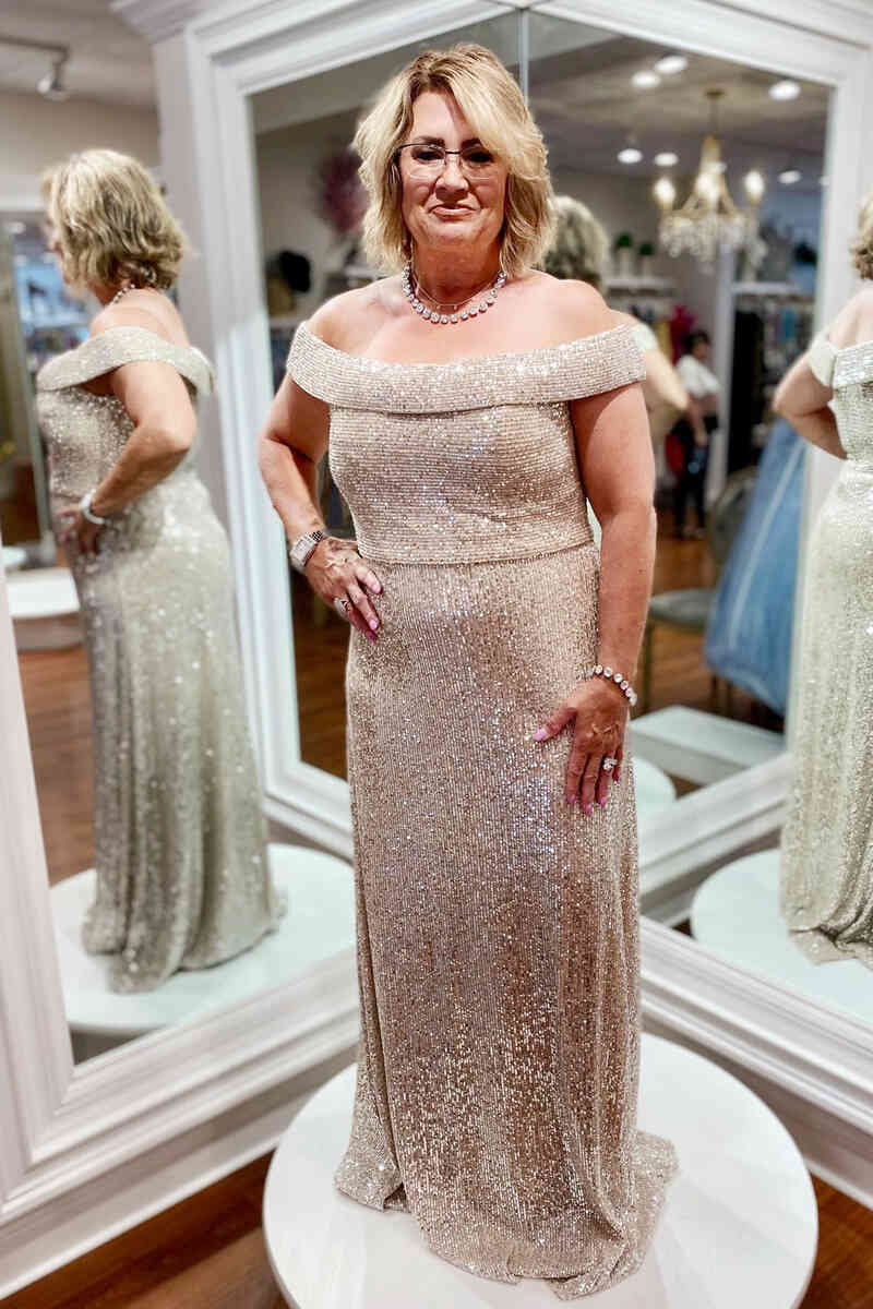 Off the Shoulder Rose Gold Sequins Mother of Bride Dress