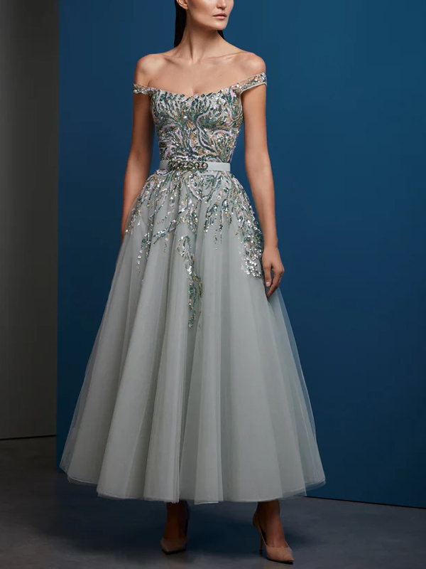Off-The-Shoulder Sequined Mesh Midi Dress