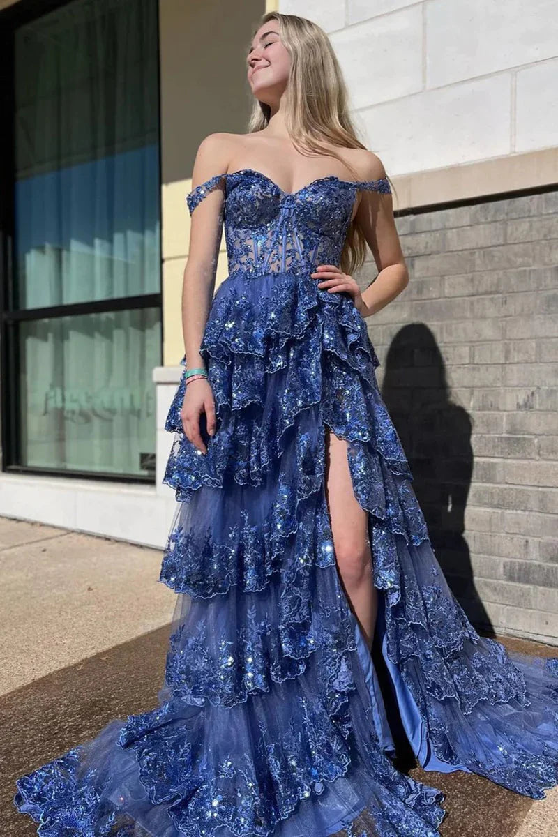 Off The Shoulder Sequins Lace Split Prom Evening Dress
