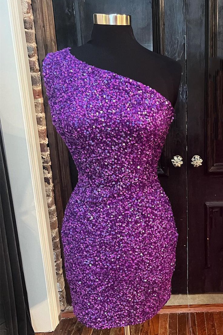One Shoulder Purple Sequin Bodycon Mini Dress Short Prom Dress fg3657
