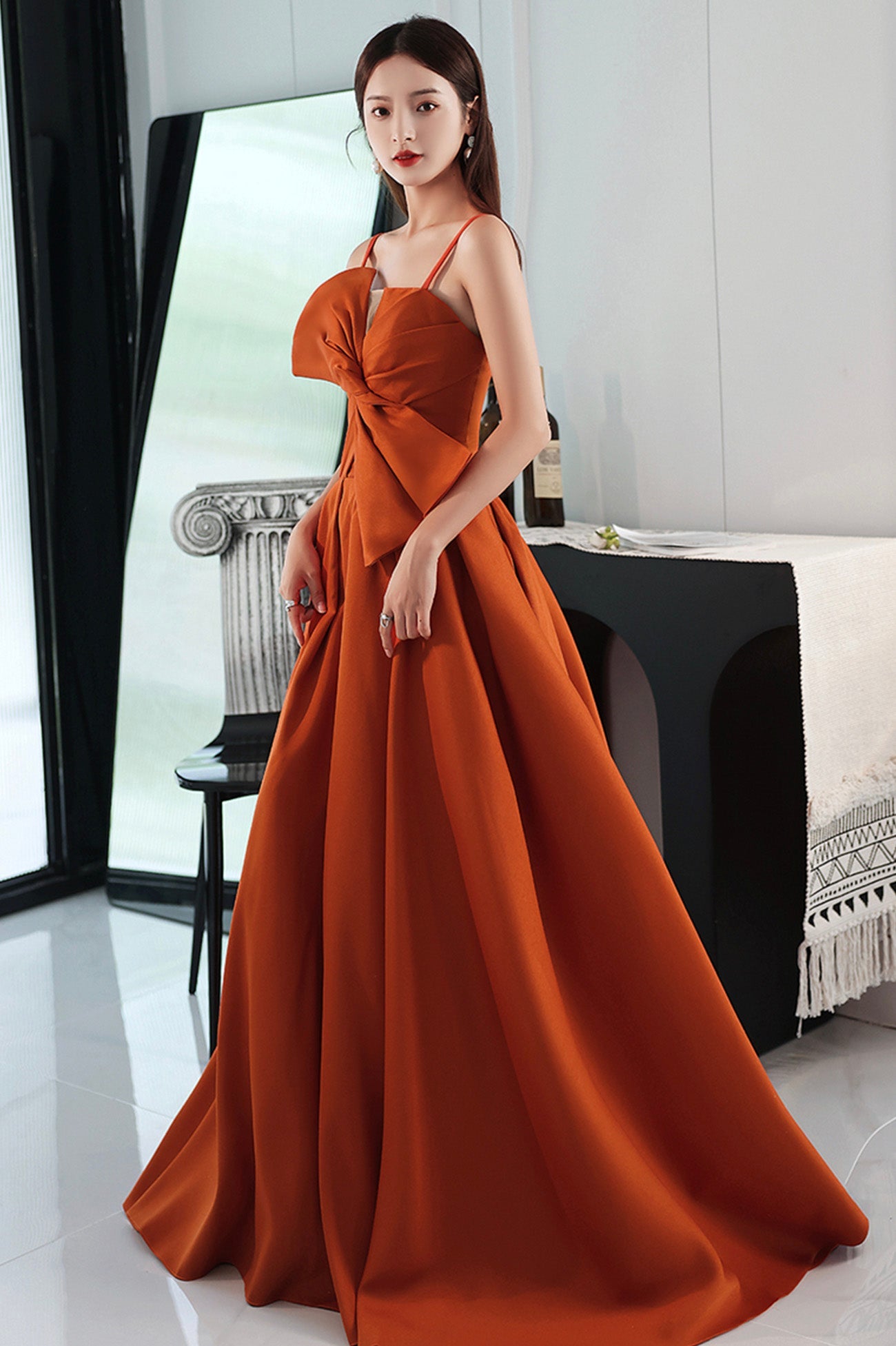 Orange Satin Long A-Line Prom Dress, Chic Evening Dress with Bow