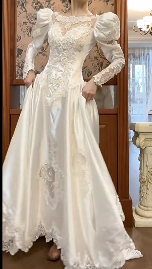 Pearl White Scoop Neck Satin Long Sleeve Beaded Lace Applique Open Back Train Vintage Wedding Dress ED02213