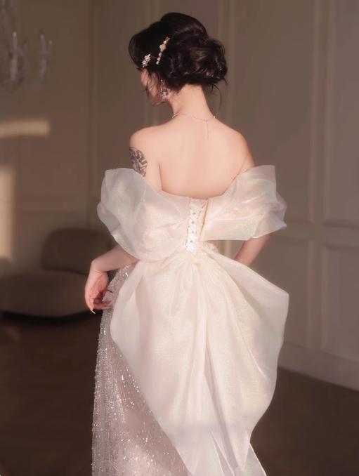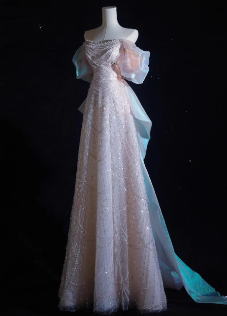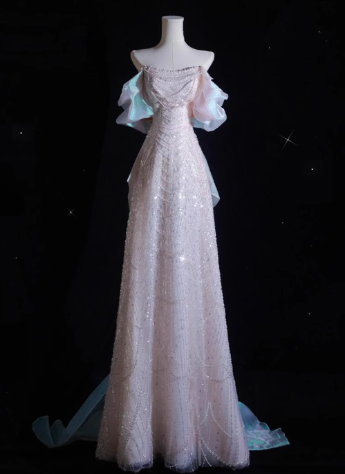 Soft Pink A-line off-shoulder tulle sequins beaded long prom dress, pink evening dress ED01033