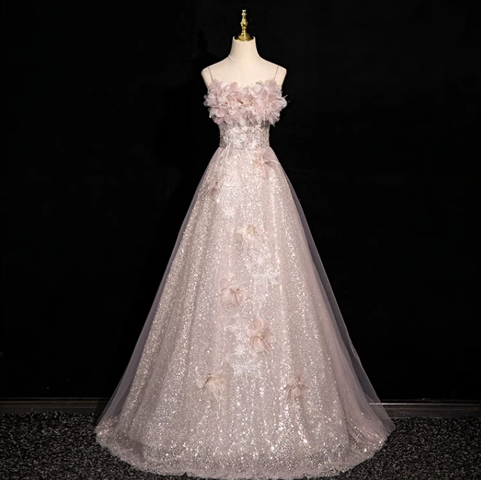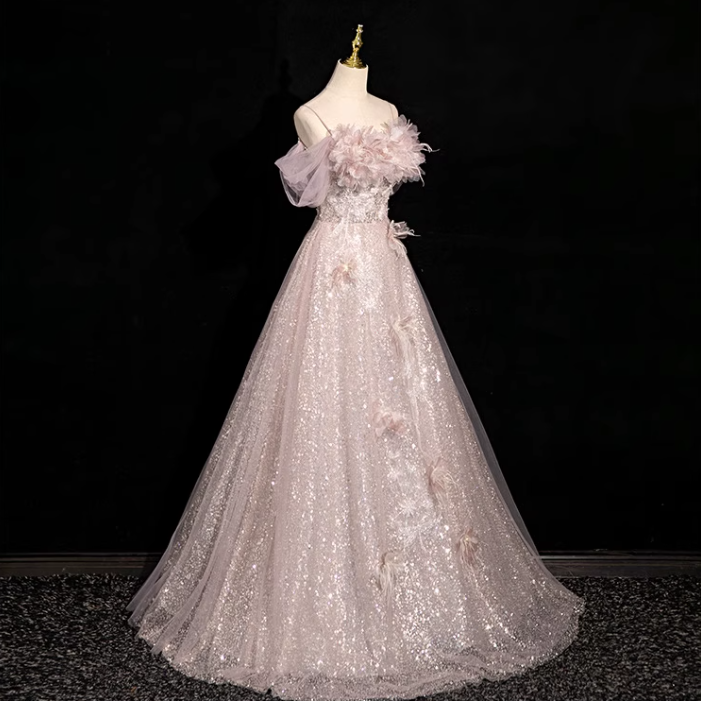 Pink A-line off-shoulder sequined tulle long prom dress, pink formal long dress ED01150