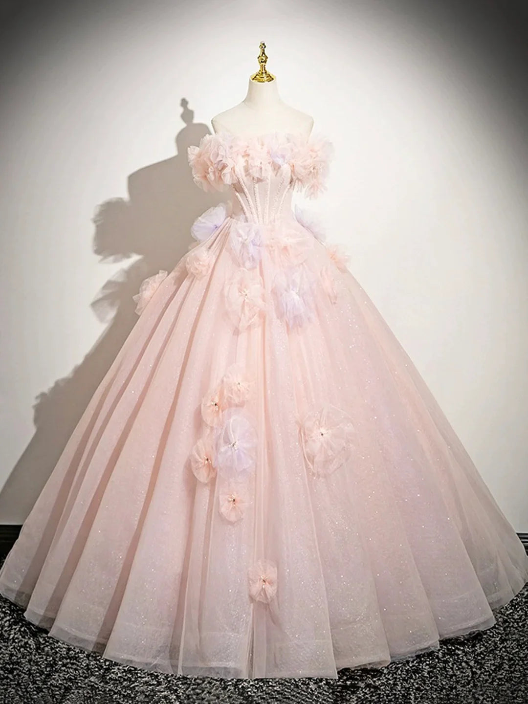 Pink A-Line Off Shoulder Tulle Long Prom Dress, Lovely Evening Sweet 16 Dress ED01222
