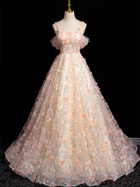 Pink A-line Spaghetti Straps Lace Tulle Flowers Sweetheart Long Prom Dress, Pink Off Shoulder Sweet 16 Dress ED01414