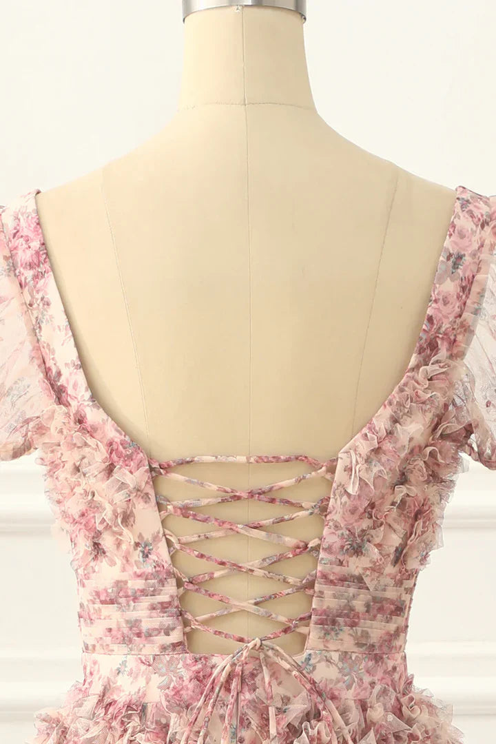 Pink A-line Tulle Pleated Floral Long Prom Dress Adult Ceremony Graduation Prom Dress ED01533