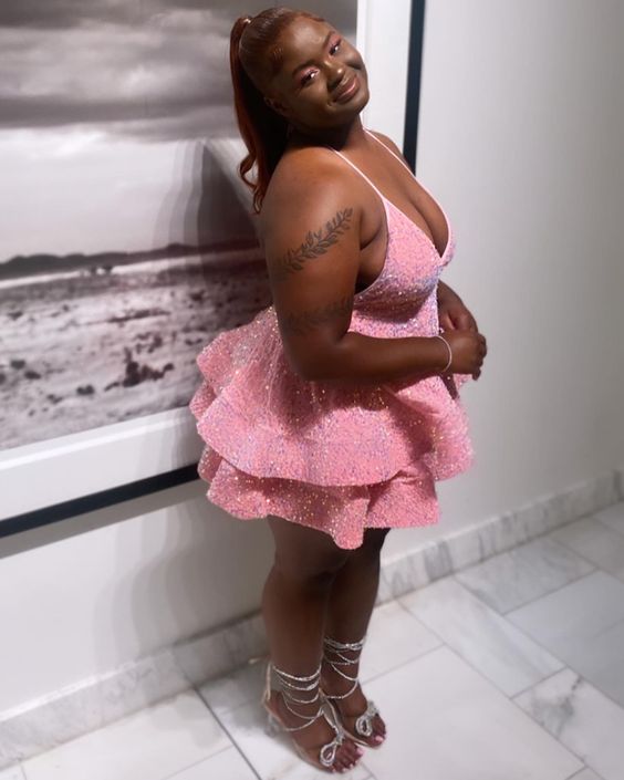 Pink Cocktail Dresses A-Line V-Neck Shiny Sequin Homecoming Dresses fg5291