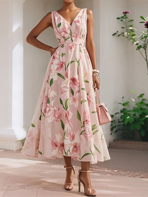 Pink Floral Classic V Neck Sleeveless A-Line Midi Dress
