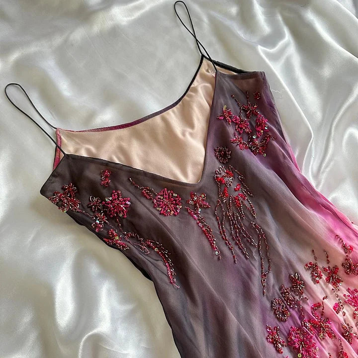 Pink Gradient Gorgeous Lightweight Exquisite Beaded Spaghetti Strap Long Chiffon Ball Gown Evening Gown Party Dress gh3339