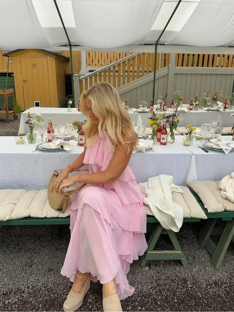 Pink Halter Fashion Halter Ruffled Tiered Ruffle Long Chiffon Tulle Ball Gown Evening Gown Party Dress gh3100