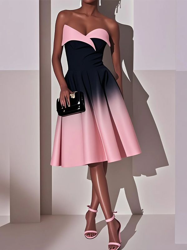 Pink Ombre Classic Strapless Sleeveless A-Line Midi Dress
