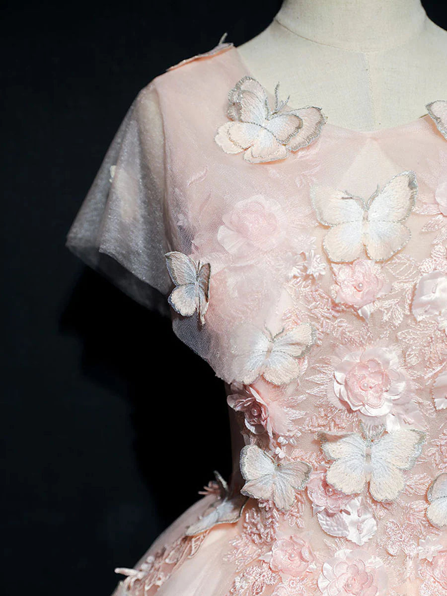 Pink round neck tulle lace long prom dress, pink sweet 16 dress ED0835