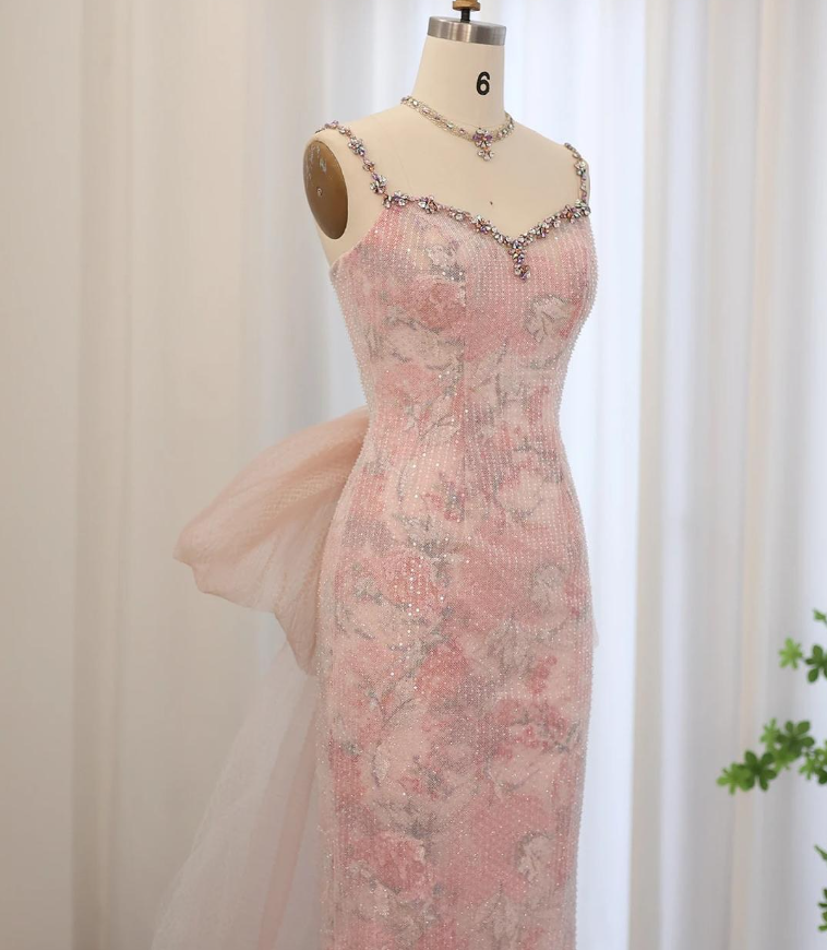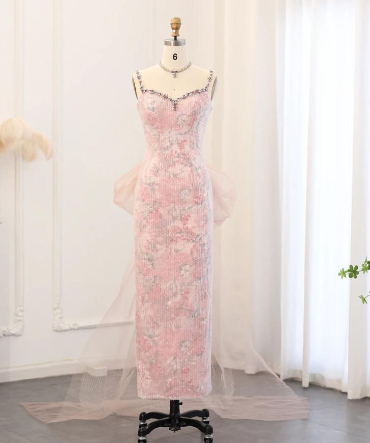 Pink Sheath Spaghetti Straps Rhinestone Sequin Tulle Prom Dress Evening Dress with Bow SH1945