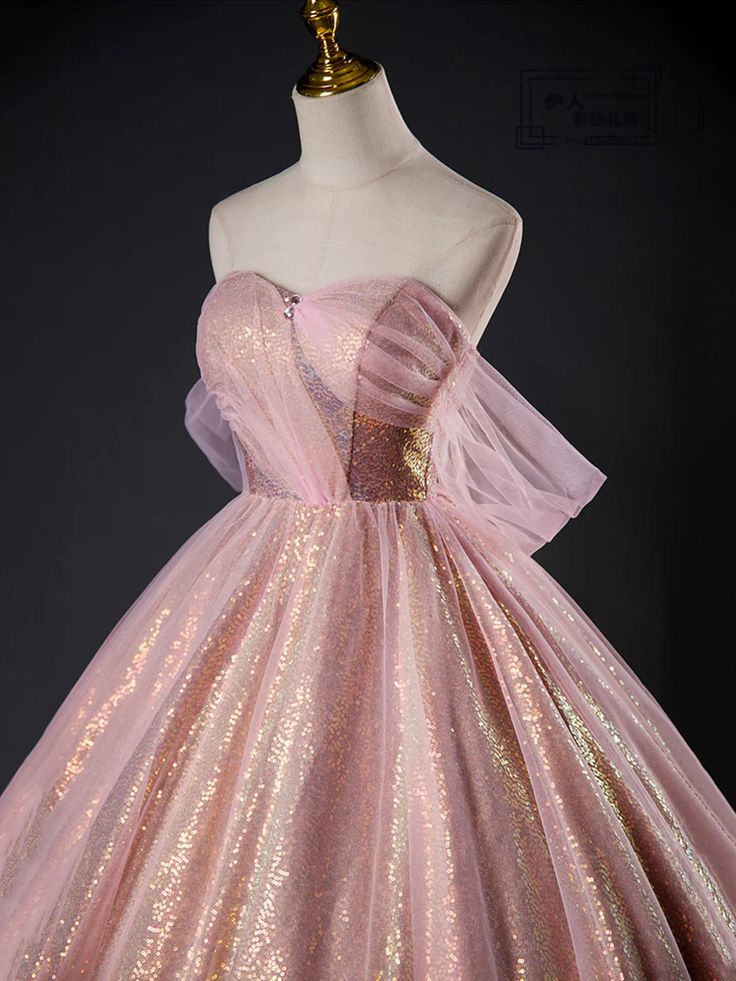 Pink Tulle Sequins Long Prom Dress, Pink Tulle Long Formal Evening Gowns fg4420