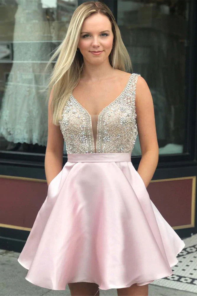 PM060,Luxury pink beaded a-line satin homecoming prom dresses