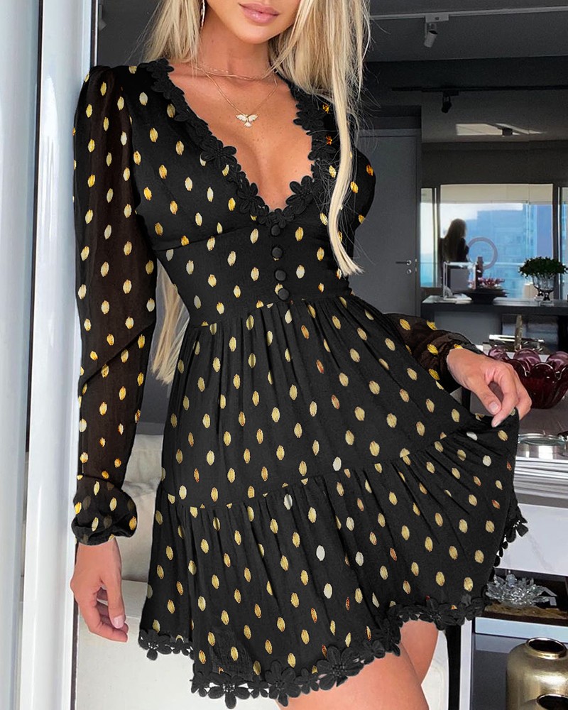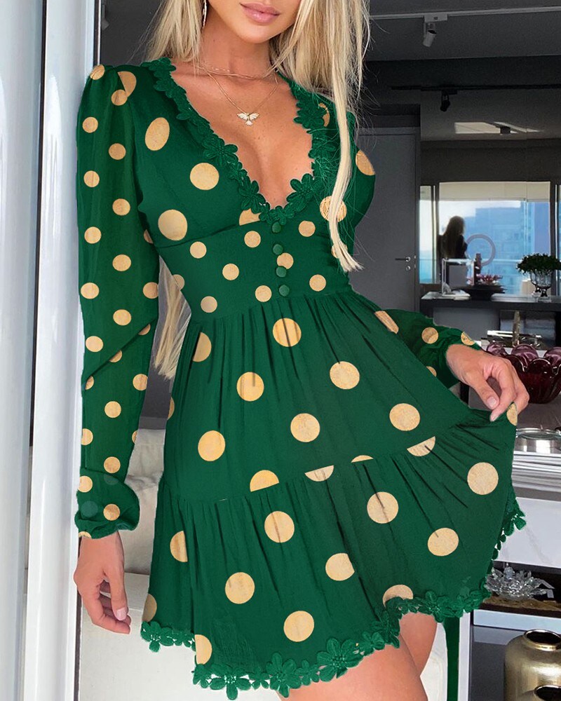 loveedsTM-Polka Dot Print Lace Trim Ruched Dress Women Sexy Plunge Long Sleeve Flared Mini Dress