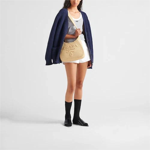 This maxi tote bag with a soft. deconstructed design is made of raffia-effect yarn. a light. natural material with a summery mood. The embroidered lettering logo decorates the front. while the emblematic enameled metal triangle logo embellishes the back.