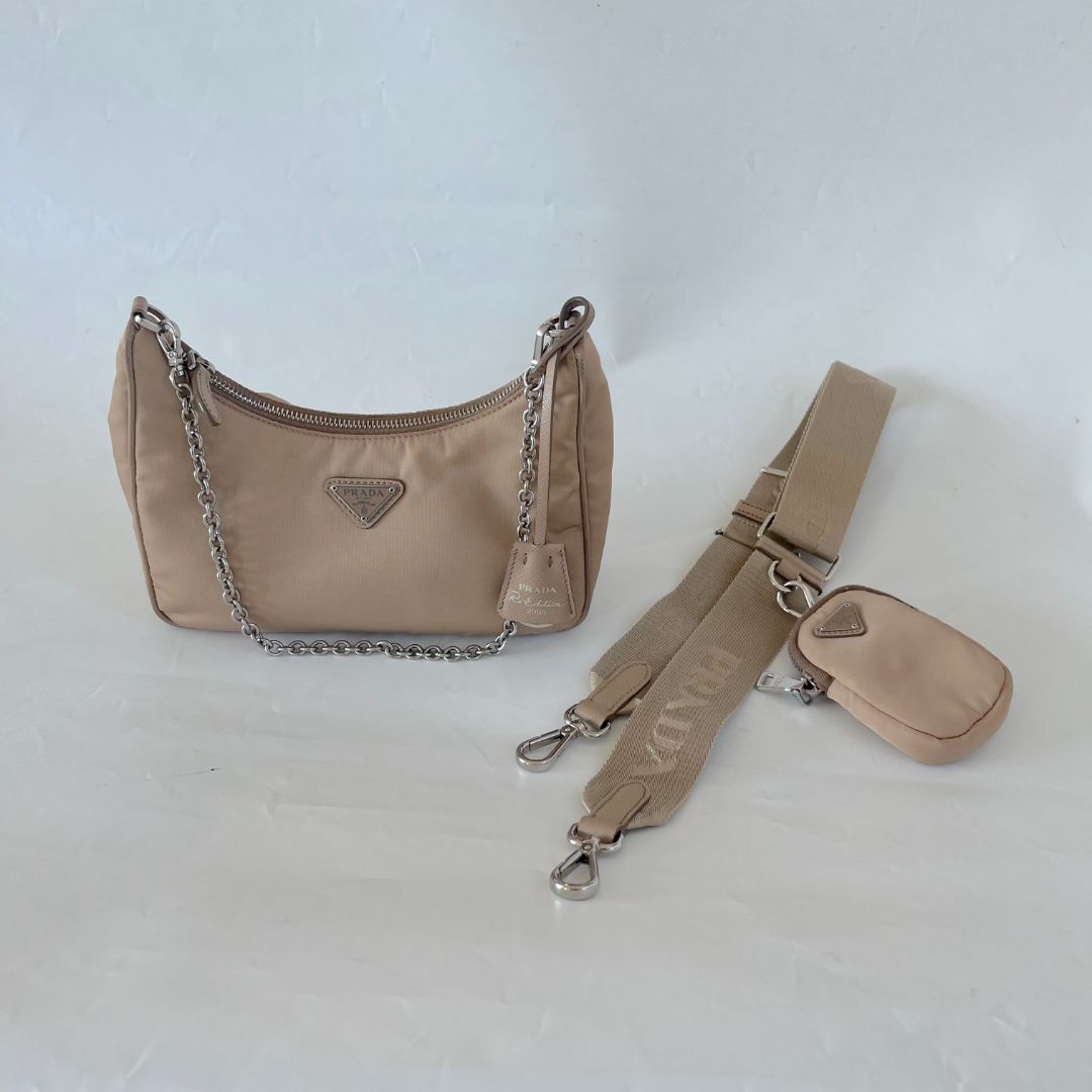 The Re-Edition 2005 Re-Nylon bag is a re-interpretation of its predecessor - the mini hobo bag. Featuring saffiano leather trims along with detachable accessories like the logo band shoulder strap, chain strap and mini zip pouch.