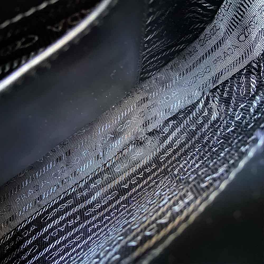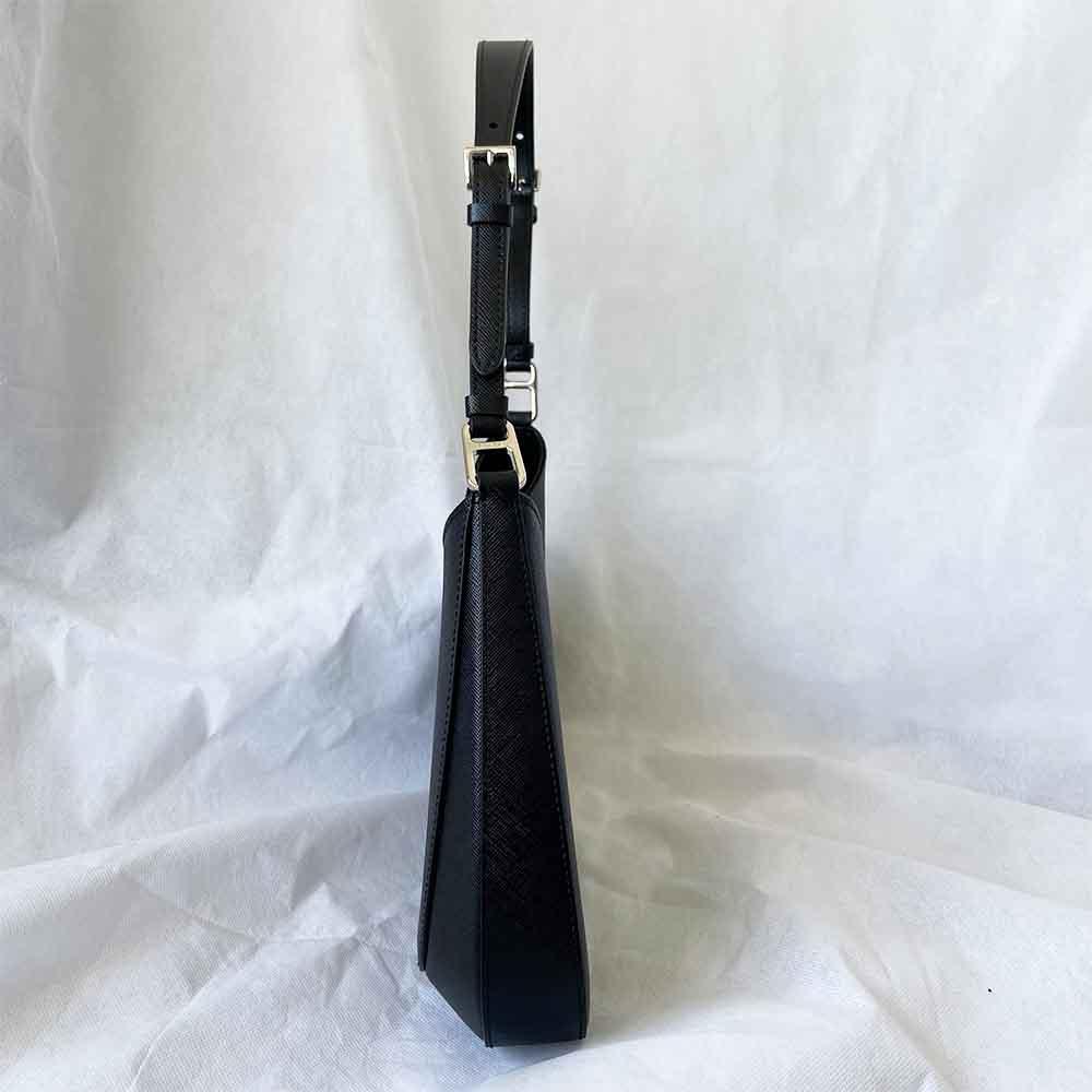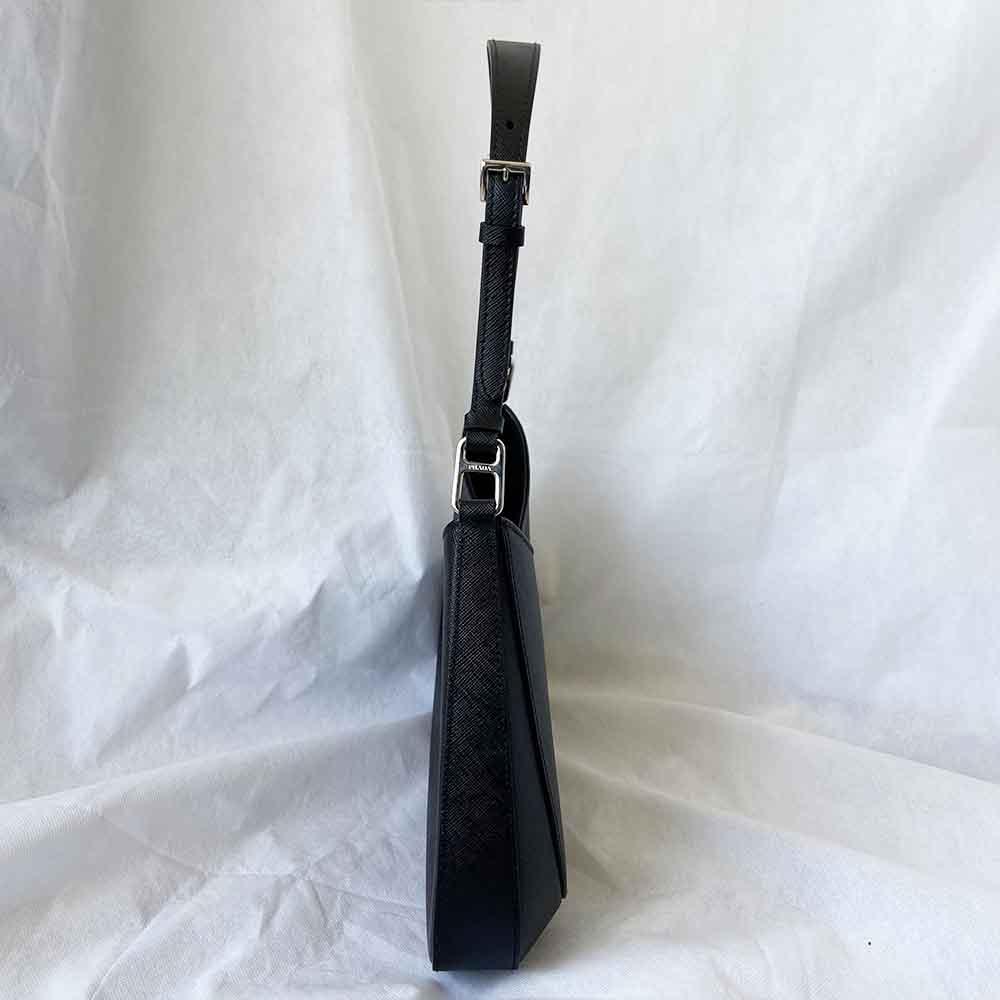 Description : Prada shoulder bag in black saffiano leather. Featuring front enamel triangle logo-plaque in silver-tone, magnet closure, adjustable leather shoulder strap, silver-tone hardware, main compartment and nylon lining with patch pocket inside.