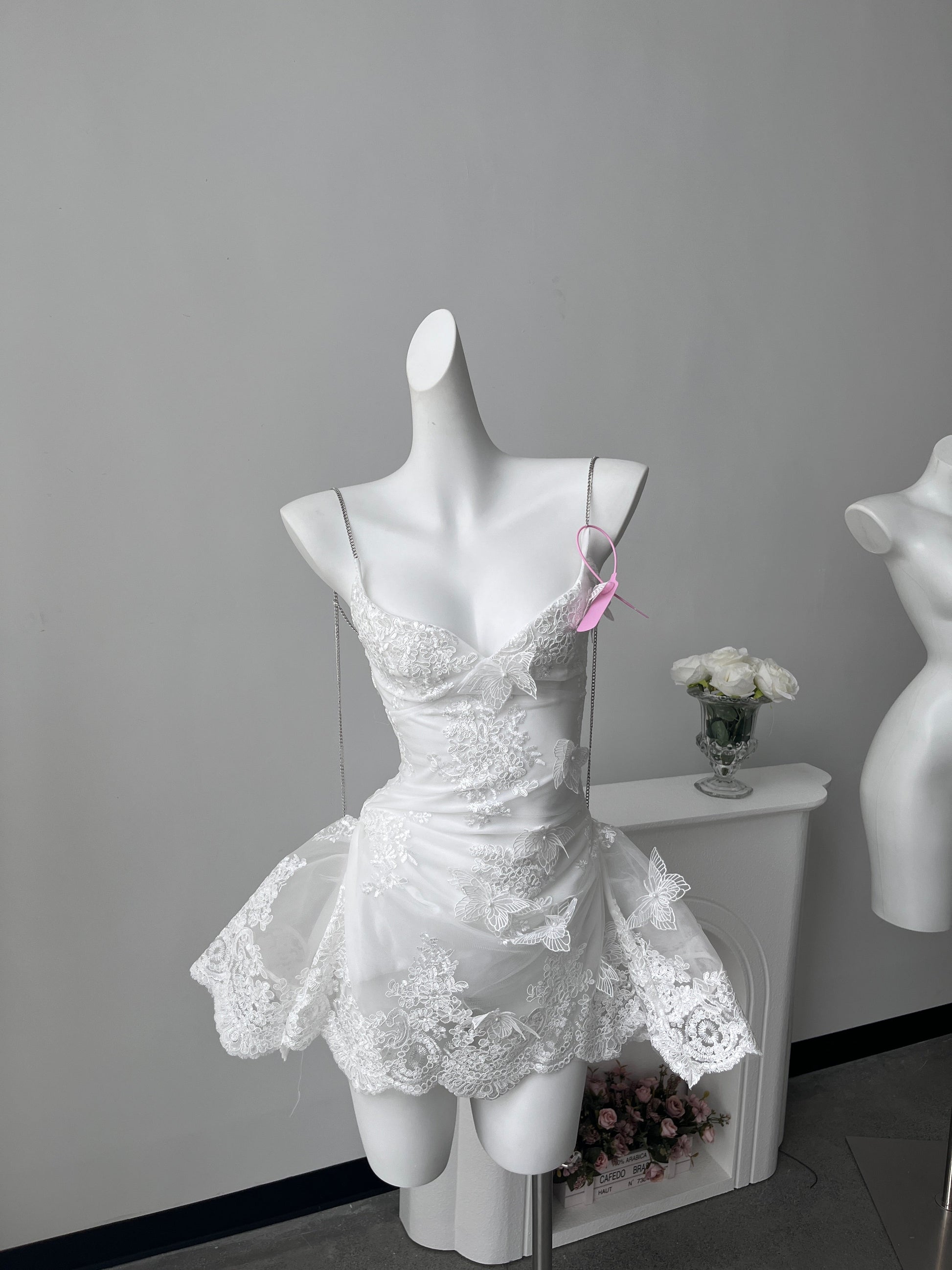 Pretty A line Spaghetti Straps White Lace Formal Homecoming Dresses Short 16th Birthday Outfits Graduation Dress Mini Cocktail Dresses DH2464